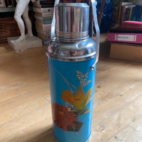Stilren og moderne termokande i flot mat blå farve med integreret sølvfarvet vippe-/hældelåg.