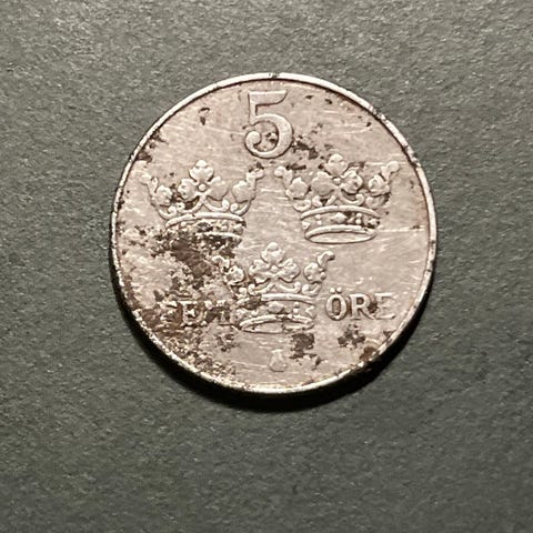 Danmark 5 øre mønt fra år 1954 med motiv af kongekronet monogram og årstal.
