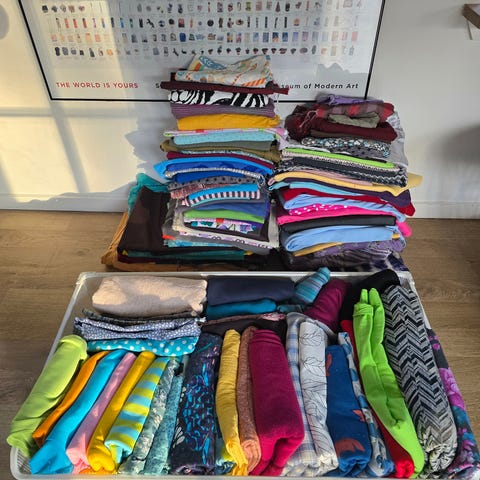 Masser af godt stof, sælges da jeg ikke har tiden til det, og pladsen mangler. Der er lige fra Jersey stof, bomulds, softshell osv. der er også masser af tilbehør. Noget stof er rester. Det meste stof er i hele meter.