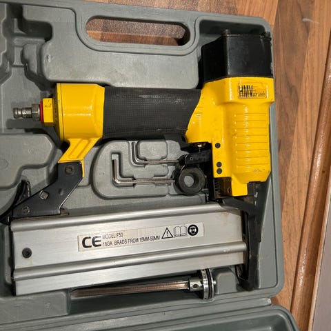 Falke sømpistol med tilbehør, opbevaret i en sort kuffert med Falke-logo. Sømspistolen er gul og grå og leveres med flere pakker søm. Egnet til forskellige sømningsopgaver. Klammer 10-40mm søm 10-50mm. Prøvet 1 gang
