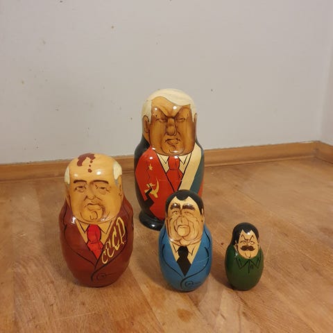 Jeg sælger disse unikke, håndmalede matroshka-dukker, der tager dig med på en rejse gennem historiens mest markante ledere. Her er ikke tale om de klassiske blomsterpiger (selvom der er én af dem med også!), men derimod politiske sværvægtere i finurlige karikaturbilleder.