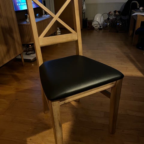 6 er almindelige stole, derudover er der en stol med armlæn.