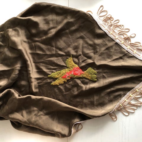 Smukt lille tørklæde i en støvet pudder farve med vævede guldtråde.