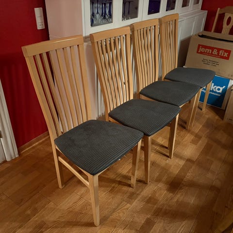Spisebordsstole i lakeret, lyst bøg med sæde af flet. Har brugsspor (se billeder), men fremstår ellers velholdt og i god stand. 6 stk sælges kun samlet for 200 kr/stk, i alt 1200 kr.