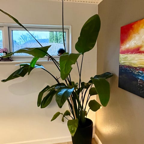 Strelitzia Nicolai ( paradisfuglplanten) stueplante med store grønne blade. Planten er velegnet til indendørs brug med de fine store blade. Danner først nye blade om sommeren.