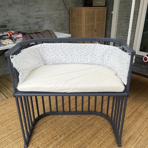Babybay Maxi Bedside Crib. Inkl. madras med ekstra madrassbeskytter og 2 hjemmesyede stræklagener. Inkl. original BabyBay sengerand. Inkl. to forskellige monteringssæt, både kroge og rem. 94 x 52 cm.