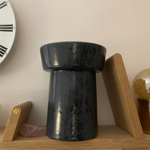 Produktbeskrivelse: De karakteristiske Hammershøi-riller har allerede fundet plads i mange designelskers hjem Norden over. Udvid din samling med den elegante antracitgrå Hammershøi-vase fra Kähler. Vasen har en smuk lille krave om halsen, der sammen med rillerne og vasens harmoniske formsprog forlænger de friske blomster, så de går i ét med den elegante keramik. Brug den store Hammershøi-vase som et unikt designstatement. Materiale: Stentøj. Højde: 25,50 cm. Diameter: 20 cm. Antracit farve. Stand: Næsten som ny