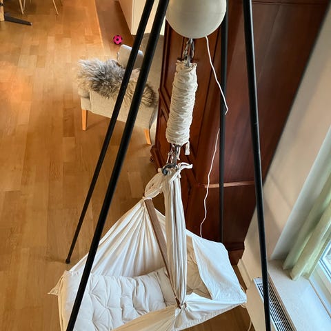 Super fin Moonboon slyngevugge inkl. Stativ, dørkamgreb og motor.