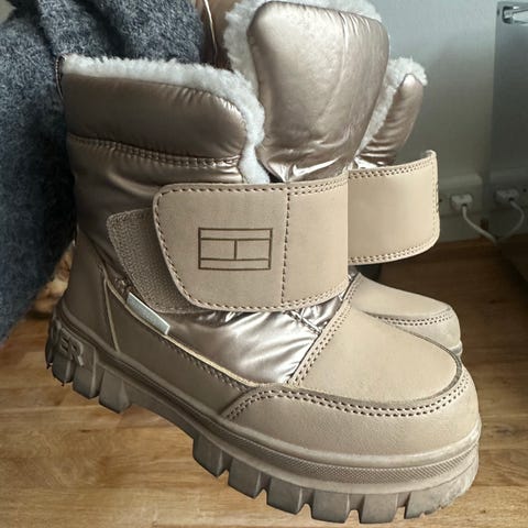 Klassiske Tommy Hilfiger unisex børnestøvler i størrelse 31 med foer. Støvlerne er blå og lavet med vandtæt materiale, hvilket gør dem velegnede til brug i våde og kolde forhold. Designet inkluderer snøreføring for justerbar pasform og en robust sål for godt greb. De er brug men i god stand (se billeder). De kan afhentes i Hellerup eller sendes på købers regning.