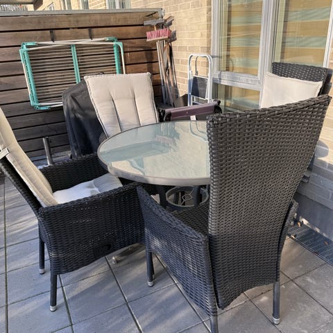 Sort havemøbelsæt bestående af et rundt bord med glasbordplade og fire stole i sort flettet materiale.