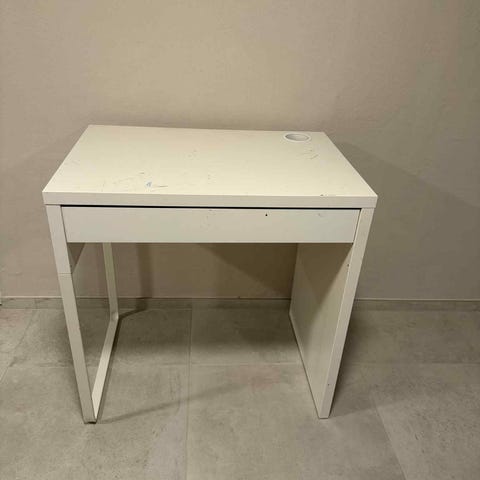 IKEA børnebord med hvid bordplade og hvidt stel. Bordet er designet til børn og har en enkel og funktionel konstruktion, der passer til børneværelser eller legeområder.
