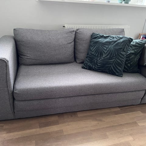 Fra Jysk: "3-personers sofa i stof. Sofaen kan nemt laves om til en seng. Sæde- og ryghynder i skum. Ben i massivt træ. Udslået liggemål 116x192 cm. B192 x H89 x D92 cm"