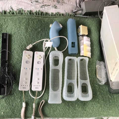 Nintendo Wii spillekonsol med tilbehør inklusive fjernbetjeninger, sensorer, kabler og oplader. Medfølgende spil: Virtua Tennis, Grand Slam Tennis og et ekstra spil. Konsollen er sort og leveres i original emballage.