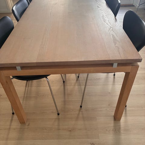 “Straight”. Spisebord med top og stel af massiv eg. Svævende plade med sprosser af aluminium. Designet 1998. Udført og mærket hos Carl Hansen. H. 72. L. 193/248(med tillægsplade). B. 93 cm.