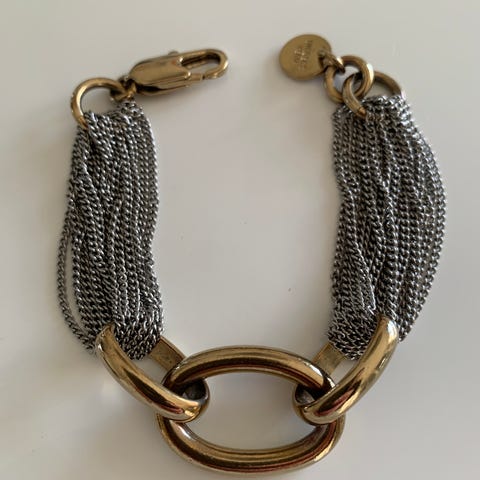 Dyrberg/Kern armbånd til kvinder, forgyldt metal med indfattede røde sten. Armbåndet har en kæde med runde led og en lås med en stangmekanisme.