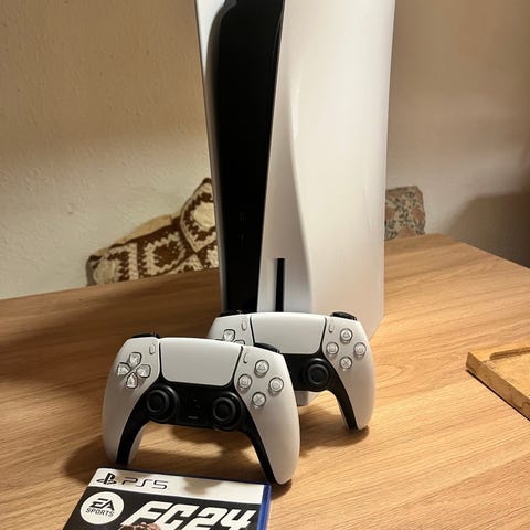 Playstation 5 spillekonsol med tilhørende to controllere. Konsollen har et karakteristisk hvidt og sort design. Controllere er trådløse med integrerede knapper og styringselementer.