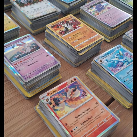 Blanding af forskellige Pokémonkort fra 2021, 2022 og 2023. Årgang kan vælges.