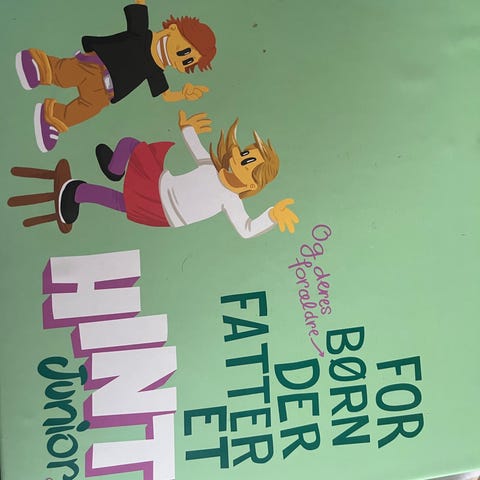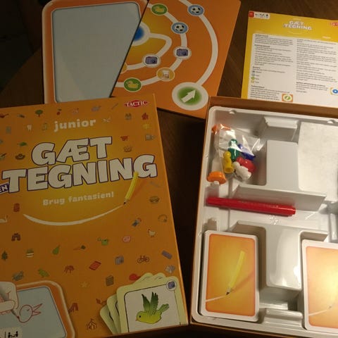 Hint Junior brætspil indeholder spilleplade, kort, spillebrikker og spillevejledning. Spillet er designet til børn og indeholder forskellige kategorier og billeder til brug under spillet.