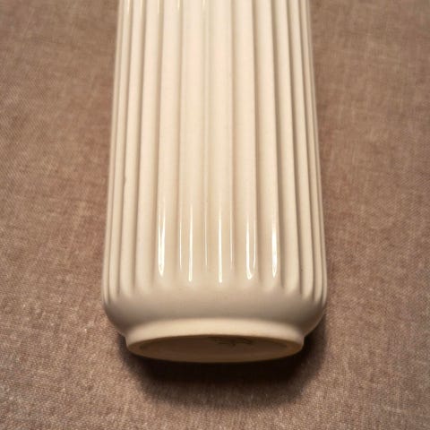 Gammel Lyngby Porcelæn vase fremstillet i hvid porcelæn med en karakteristisk rillede overflade. Vasen har et enkelt og tidløst design, der passer til forskellige indretningstyper. H ca 15 cm. Fin stand uden skår.