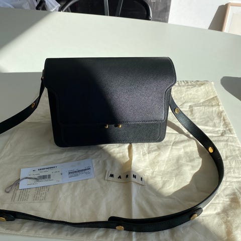 Jeg er ved at rydde op i klædeskabet og sælger kærestens Marni taske. Den har aldrig været brugt, og fremstår som helt ny. Der er stadig plastisk på spændet.