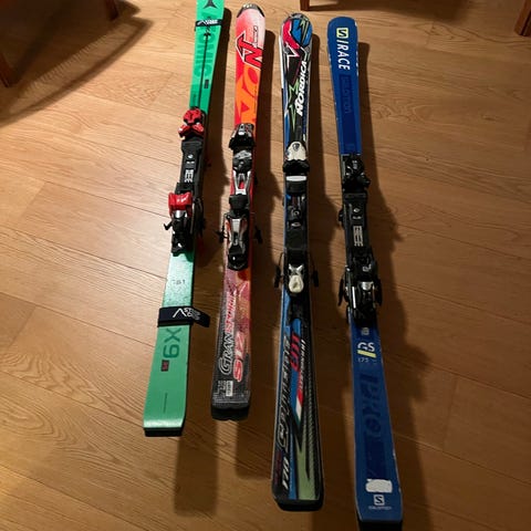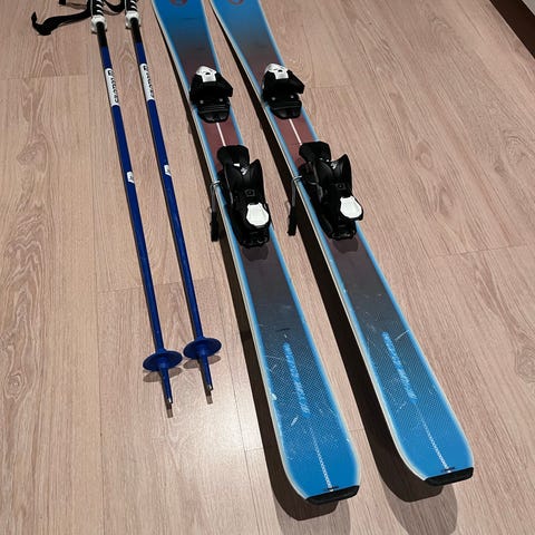 Skiene er købt januar 2024, har stået på ski 3 ferier og er blevet fuldt serviceret sidste år. De ser meget gode ud og er i god stand. Skiene kan nemt justeres frem og tilbage, så de kan bruges af flere personer med forskellige skostørrelser.