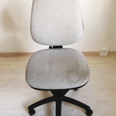 Grå stol med dreje sokkel. kontorstol i plast med justerbar højde og hjul under stellet. Stolen har en moderne, ergonomisk udformning og et metalstel med fem ben og hjul, som gør den mobil og velegnet til kontorbrug.