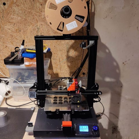 Creality CR-10 3D-printer i sort farve med aluminiumsramme. Printeren har en opvarmet byggeplade og et stort byggevolumen, velegnet til forskellige 3D-printopgaver.Jeg kan ikke finde ud af det....