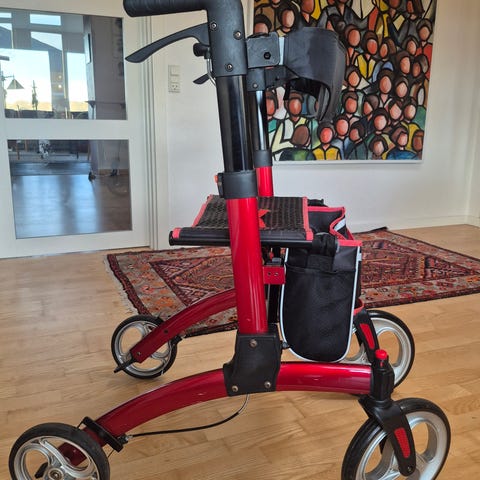 Rollator med fire hjul og kurv blå