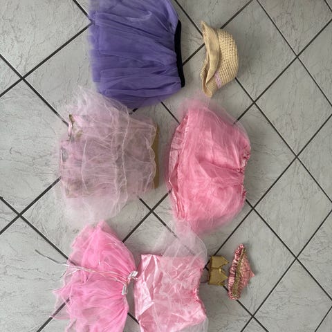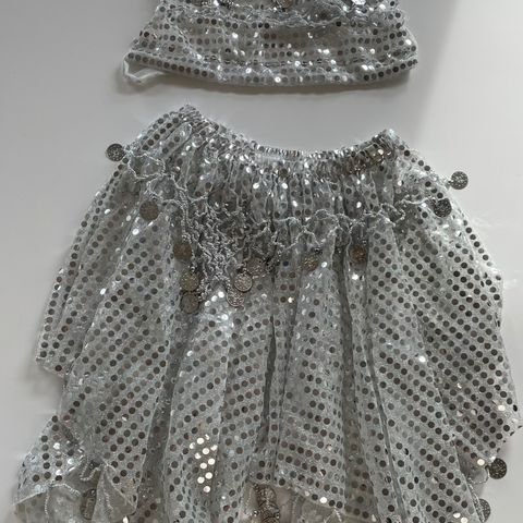 Tilbehør til mavedanser-udklædning: to armbånd, underdel, kæde, øreringe og hårbånd.