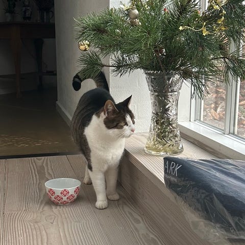 Katten gives bort, da vi har fået hund, som ikke kan enes med katten.