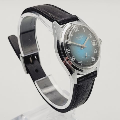 Sjælden Brixon, electronic med transistor- styret balance, altså et elektrisk/mekanisk ESA 9157 værk. Uret måler 37mm i diameter og 13,4mm i højden. Skiven er i særdeles flot stand. Sidder på en NOS Jean Rosseau kvalitets læderrem. Uret går fint. Jeg fortsætter oprydningen i ursamlingen. Uret kan afhentes på Sydsjælland, alternativt sendes.