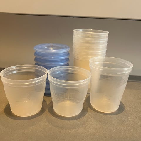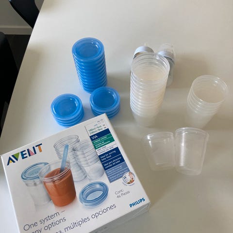 Praktiske Philips Avent bøtter/kopper. De er super gode til opbevaring af modermælk og senere, har vi brugt dem til grød/mos, snacks og frugt til turen.