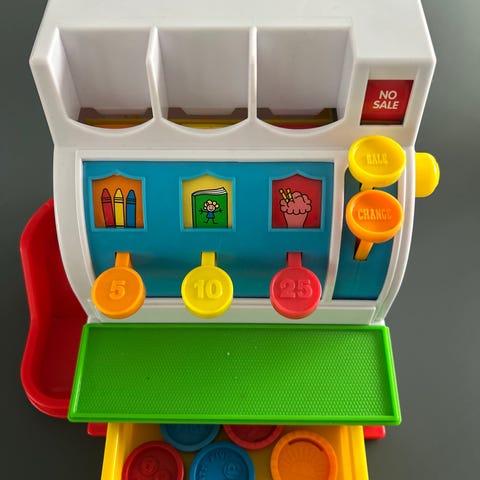 Fisher-Price legetøj kasseapparat i plastik med farverige knapper og håndtag. Designet til børn, med rum til legetøjspenge og funktionelle knapper til leg. Velegnet til rolleleg og udvikling af motoriske færdigheder.