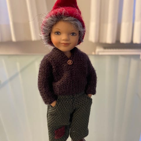 Handlavet iført rød hue, cremefarvet stribet skjorte med knapper og brune bukser med seler. Fine detaljerede ansigtstræk og tøj i bløde materialer.