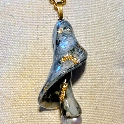 Halskæde vedhæng lavet i resin belagt konkylie m. Blad sølv og gyldent grønt glimmer pålagt. Samt med Stirling sølv top og ferskvands perle med Stirling sølv nål.
