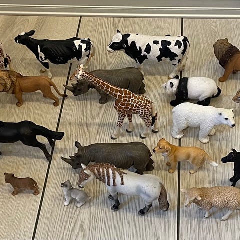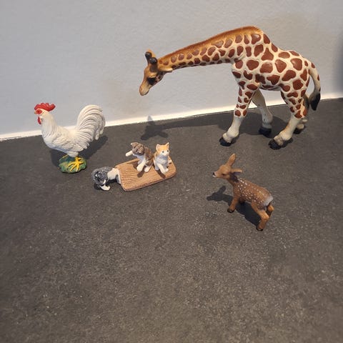 5 Schleich dyr, giraf, to tigere, han og hun tiger, en zebra og en isbjørn. Elefanten er ikke Schleich men kommer gratis med.
