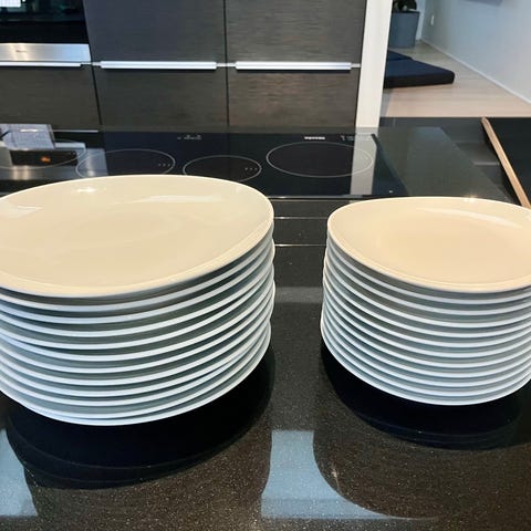 8 stk. store (045) og 6 stk. små (044) franske Pillivuyt tallerkener af den fineste porcelæn som kan gå i ovnen og fryseren.