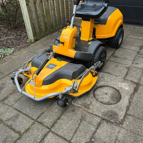 Stiga Park plænetraktor med gul og sort farve. Udstyret med sæde, rat og motor. Egnet til græsslåning i private haver eller mindre områder.