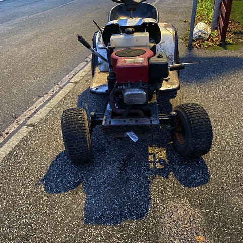 Cub Cadet plænetraktor udstyret med Briggs & Stratton motor. Maskinen har et sæde, rat og brændstoftank, og er designet til græsslåning. Farven på plænetraktoren er gul med sort sæde og styring.