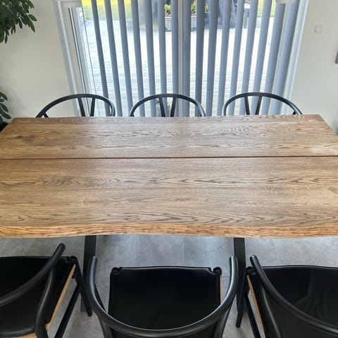 Massivt 4,5 cm egetræ plankebord med 2 tillægsplader á 50 cm. 200 cm langt og med begge plader 300 cm.