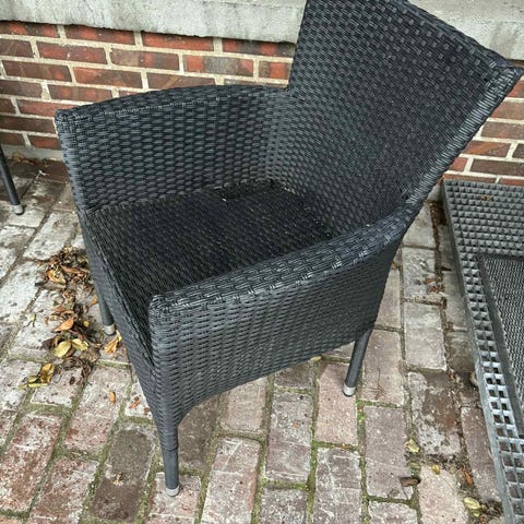 Havemøbelsæt bestående af et stort bord 1x2 meter med træbordplade og otte stole i sort flettet polyrattan.
