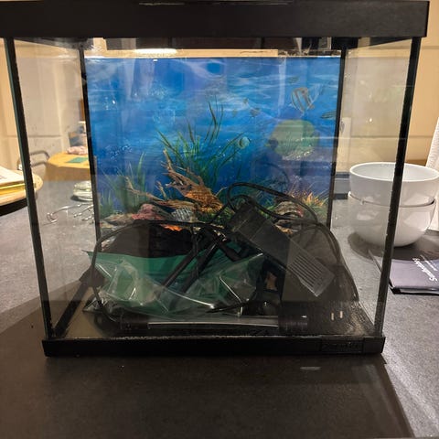 Akvariet er fremstillet af glas. Det inkluderer en sort låg med integreret lys og kabler til tilslutning. Velegnet til opdræt af ferskvands- eller saltvandsfisk.