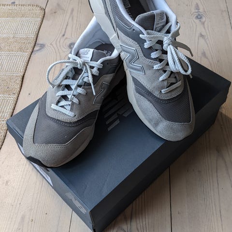 Størrelse 44,5, fitter som en Nike 44. Skoene har et design med lyseblå og grå farver. Har været en tur rundt om blokken 30 min, fremstår som helt nye. Nypris er 1600kr.