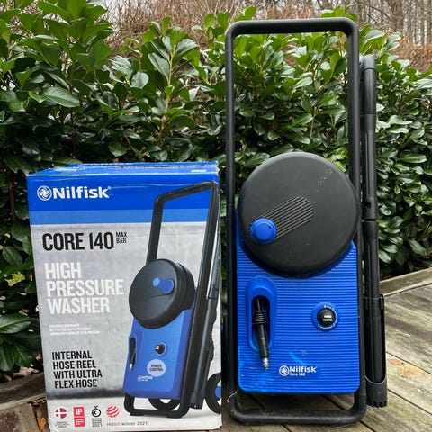 Nilfisk C 120.7-6 højtryksrenser i blå farve. Inkluderer tilbehør som slange, sprøjteflaske og rengøringsmidler. Velegnet til rengøring af udendørs overflader.