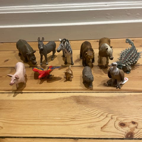 Schleich Dyrefigurer sæt med nuttede dyr inklusiv hunde og kaniner i forskellige størrelser og farver.