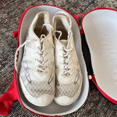 Varsity Cheerleadersko str. 40.5. Skoene er kun meget lidt brugt - ikke en gang en sæson - og kun indenfor. De er hvide/grå og er altid blevet opbevaret i tilhørende grønne taske. De er små i størrelsen. Kan afhentes i Aarhus N. eller sendes på købers regning.