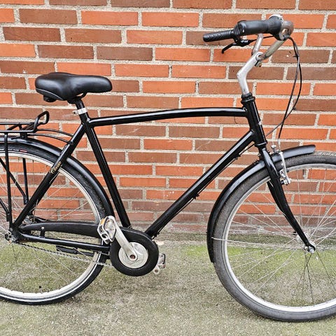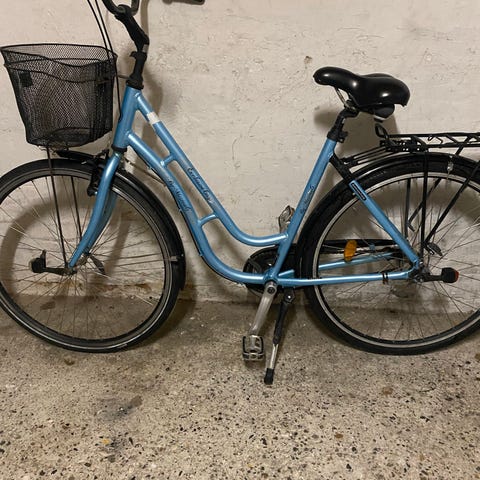 En flot Mustang-cykel med 3 gear, fremragende udseende, en kæmpe kurv, 2 lygter, en støtteben, en ringeklokke, en bagagebærer, nye dæk, en ny og smurt kæde, en lås med 2 nøgler, egnet til højder 165-190