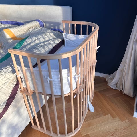 Babybay bedsidecrib, høj og bred model i ubehandlet træ. Købt på mycopenhagenkid i august 2024. Brugt cirka 8 mdr.