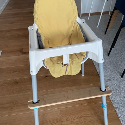 IKEA Antilop højstol med aftagelig pude i rød og hvid stribet mønster. Højstolen har ben i grå farve og er designet til børn. Puden giver ekstra komfort under brug. Puden er vendbar.
