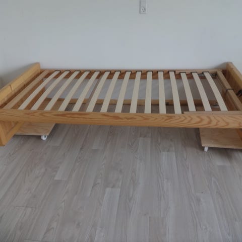 Vokseseng. Med juniormadres 135x75. Obbevaringsskuffe under. Massivt fyrtræ.